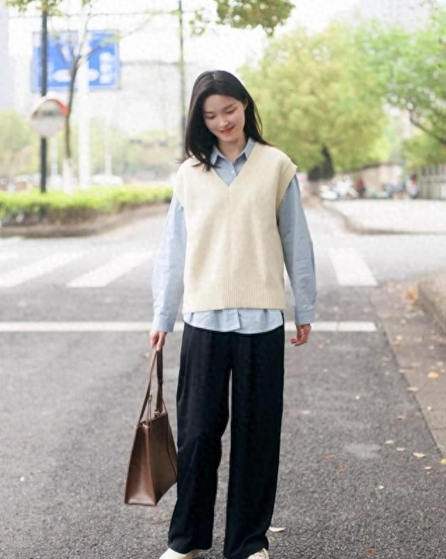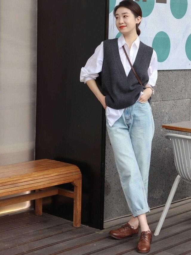 •日常通勤→白衬衫+竭诚V领马甲+牛仔直筒裤