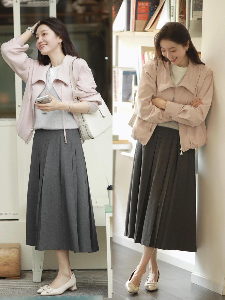 职场上班的你,推选你选拔用上头这一对白色的浅口粗跟单鞋,穿在脚上雄厚性好,还不累脚,再配上灰色的压褶 A 字半裙,鸠合粉色的夹克小外衣,内搭灰色马甲,叠穿白 T 恤,这么的穿衣打扮既斯文又当然,呈现仙女气味。这么的穿衣有经营,才是生涯里最确切的底色。
