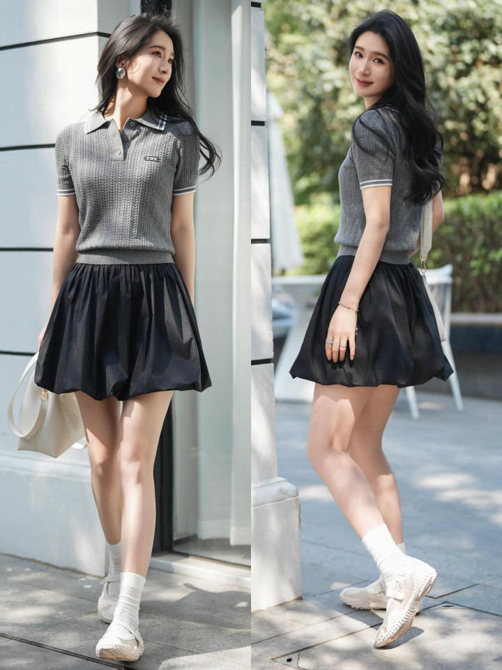 偏疼俏皮的学院风,用一件灰色真挚POLO 衫配上玄色灯笼短裙,脚踩一对失业通顺鞋,增强穿搭者的失业元素,显得更有活力,元气满满。