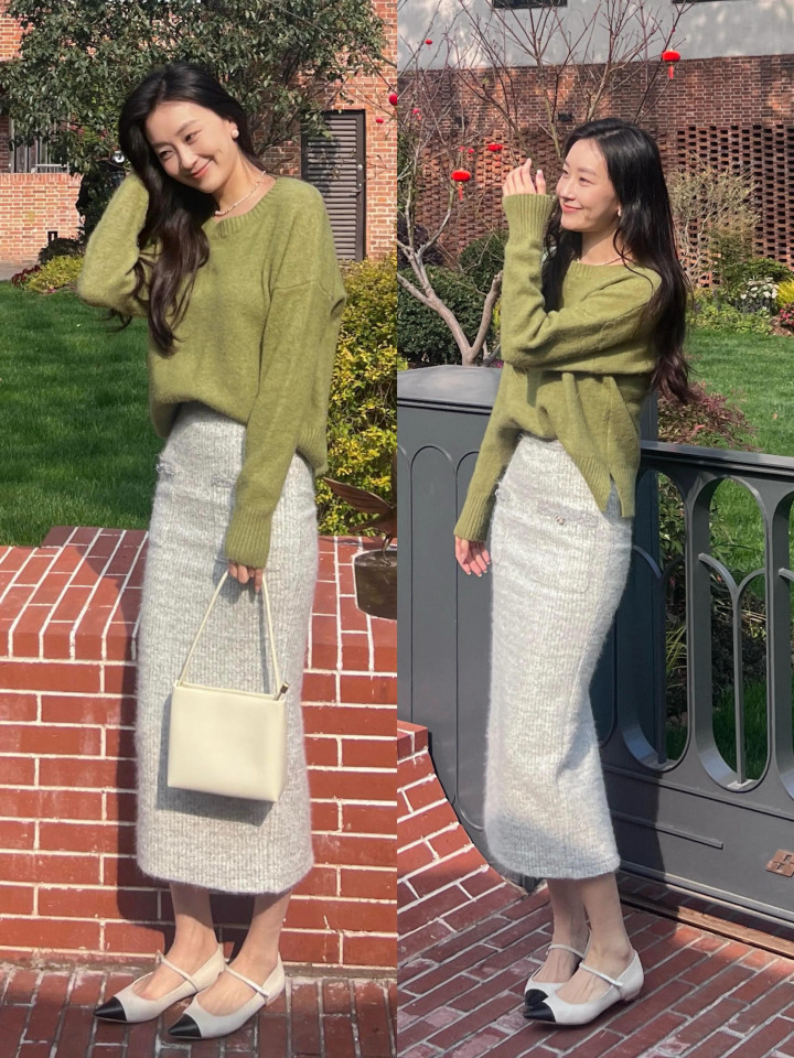 如果你慎重不雅察,这两年许多女性其实照旧毁灭了高跟鞋,不会选拔过高的鞋跟,反而选拔平底鞋、低跟鞋来穿搭。举例用口角拼接的尖头低跟单鞋,配上灰色直筒半裙和绿色的真挚上衣,平素通勤和煦多礼大方。