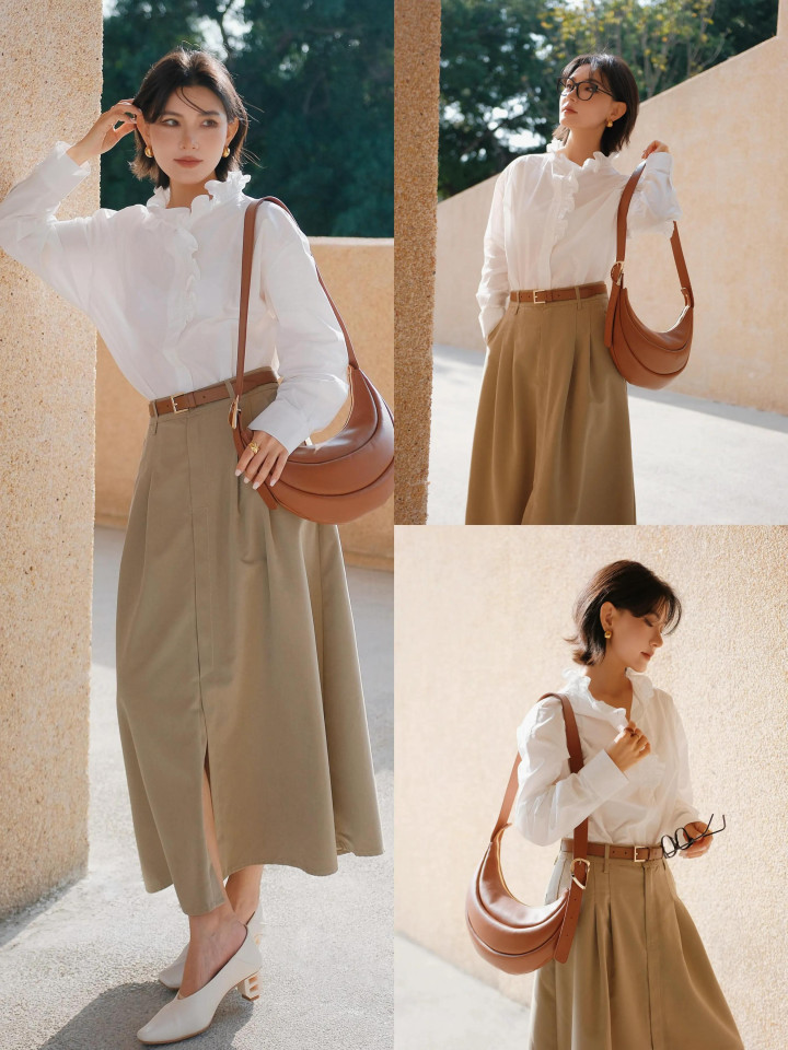 Tips①:木耳边小众衬衫+卡其色伞裙