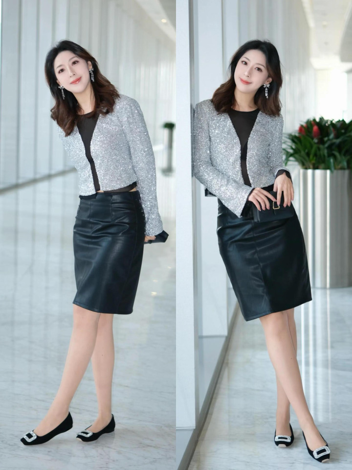 偏疼轻熟风的穿搭,用银灰色与玄色拼接的上衣配上玄色皮坦爽筒半裙,脚踩玄色平底单鞋,既优雅又有大气的轻熟风,平素穿搭更容易呈现你的气场与魔力。况兼浅口的单鞋还能蔓延我们的腿部线条,让你领有大长腿。