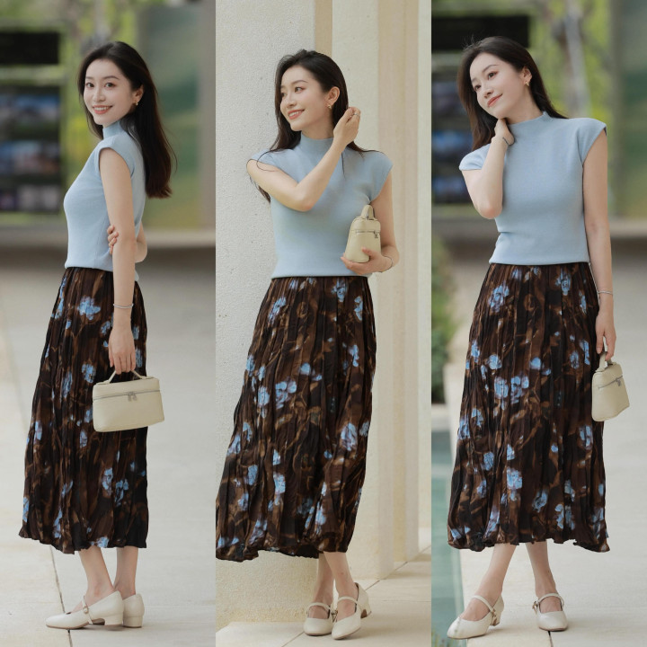 白色的粗跟单鞋绝顶的百搭,我们不错选拔用棕色和蓝色印花的半裙来搭配雾霾蓝的真挚短袖,既和煦又优雅。