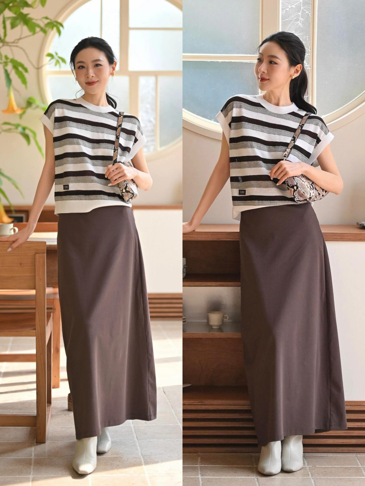 Tips③:条纹短袖+棕色直筒半裙