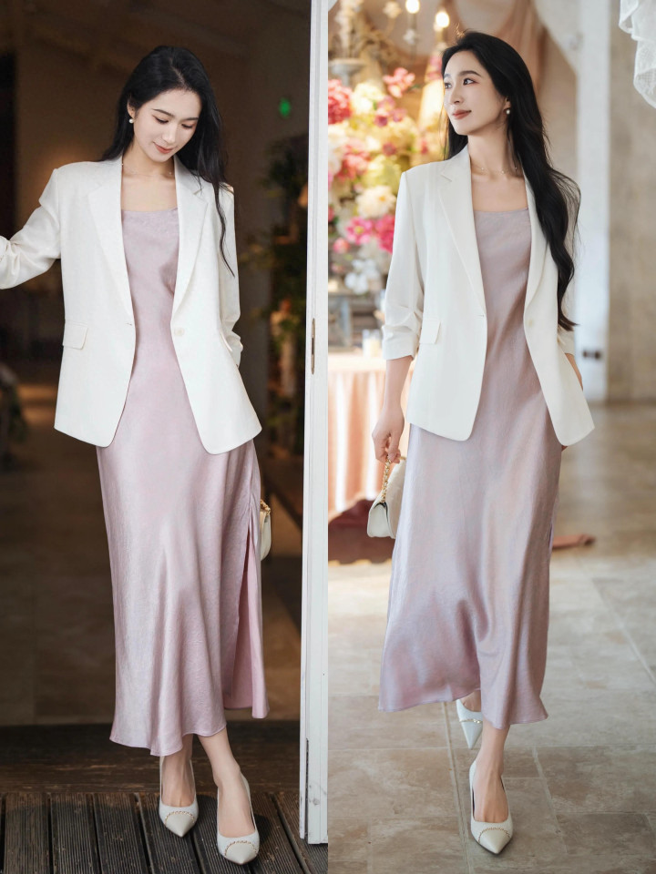 在这百花齐放的季节,不妨选拔一件白色西装外衣配上粉色真丝连衣裙,外短内长的穿搭更容易擢升腰线,使得形体比例更合营。脚踩一对拼接色浅口高跟鞋,干净利落又显气质。