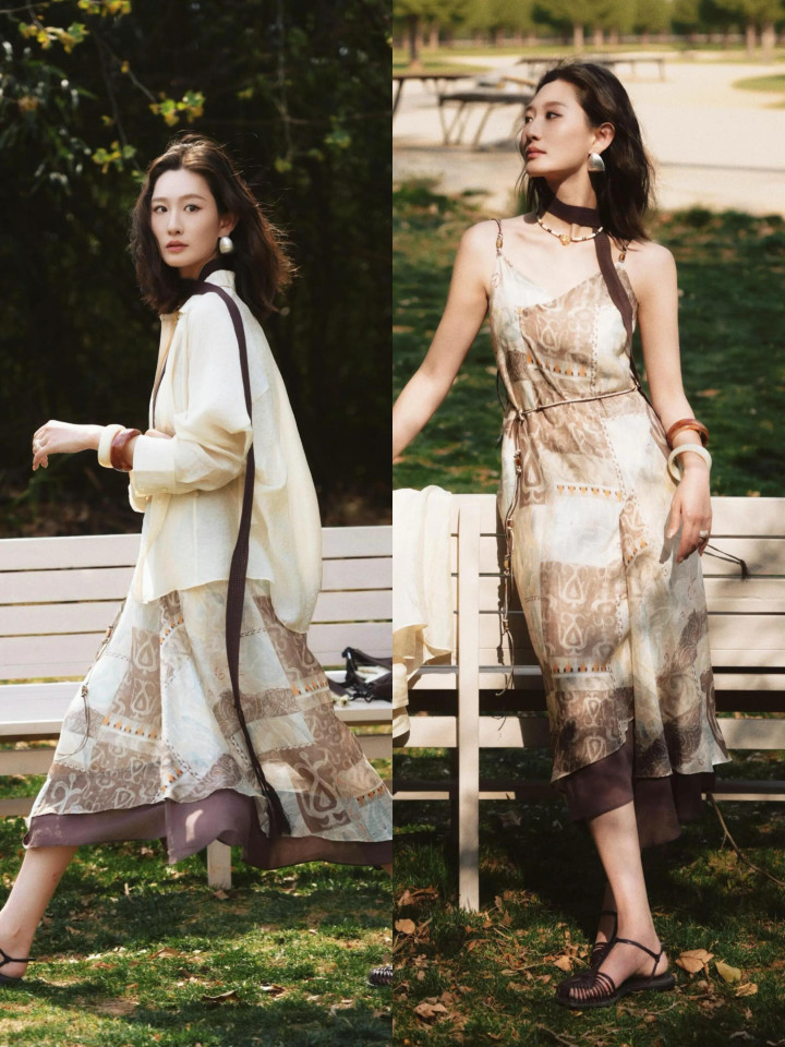 不外单穿一条吊带连衣裙过于单调,不妨再加上一件浅黄色的衬衫,造成“繁简鸠合”的穿衣妙技,这种柔柔配色和煦高档,拍出来的像片更有档次。