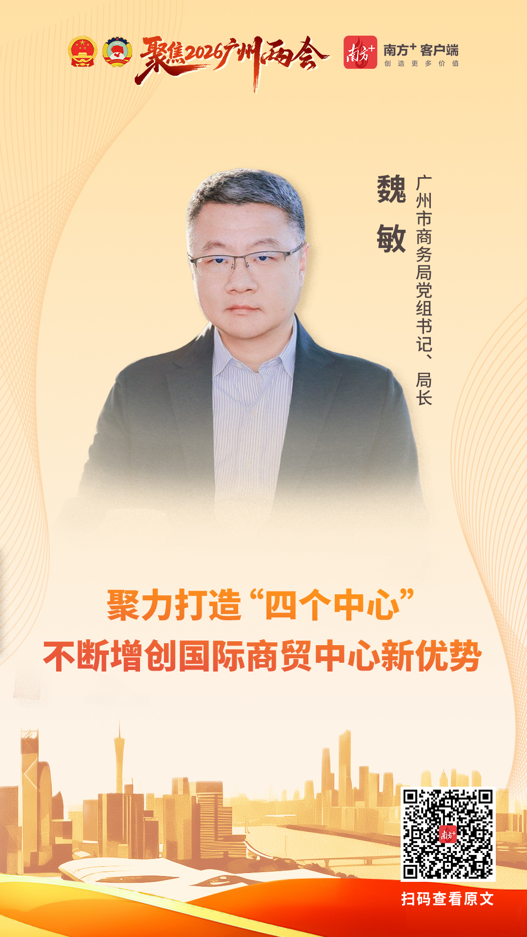 迈上新台阶,奈何构筑新上风?2026广州两会召开之际,广州市商务局党组文书、局长魏敏收受南边日报专访,系统勾画了广州以全面增强海外商贸中心功能为总牵引,聚力打造海外奢侈中心、海外营业中心、海外会展中心、海外产业链供应链中心的“十五五”发展蓝图,为广州链接在高质料发展中推崇“领头羊和火车头”作用清亮了商务旅途。